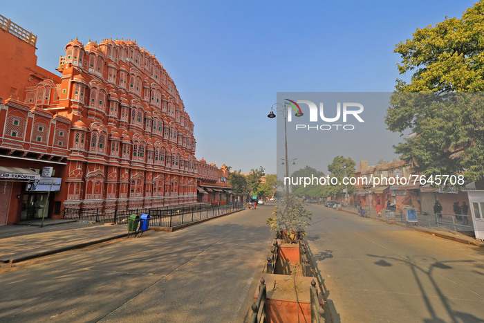 A deserted view near historical Hawa Mahal during the weekend curfew imposed by the Rajasthan government to curb the spread of COVID-19 , at walled city in Jaipur , Rajasthan, India, on Sunday, Jan 16,2022. (Photo by Vishal Bhatnagar/NurPhoto)