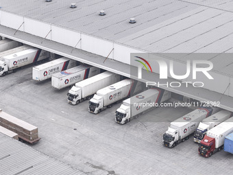 Express trucks from several companies load and unload parcels at a logistics park in the Huaian Economic and Technological Development Zone in Huai'an, China, on November 1, 2024.