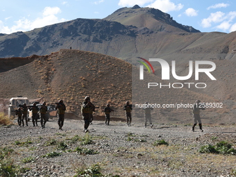 Indian army soldiers with the latest weapons, such as launchers, machine guns, and modern assault rifles, perform tactical drills on the occasion of the 26th Kargil Vijay Diwas in Kargil, Ladakh, India, on July 26, 2025. In a demonstration of its growing indigenous defense capabilities, the Indian Army showcases its latest high-tech artillery and weapons. The display features an array of cutting-edge systems, including upgraded assault rifles, advanced artillery, and specially designed drones for high-altitude and challenging terrains like Ladakh. Kargil Vijay Diwas, celebrated on July 26, commemorates India's victory over Pakistan in the Kargil War of 1999.