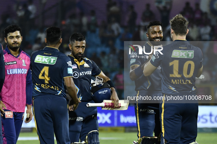 Gujarat Titans battters Hardik Pandya and Wriddhiman Saha celebrate their win in the IPL 2023 T20 cricket match between Rajasthan Royals and Gujarat Titans , at Sawai Mansingh Stadium , in Jaipur, Rajasthan, India, May 05, 2023. (Photo By Vishal Bhatnagar/NurPhoto)