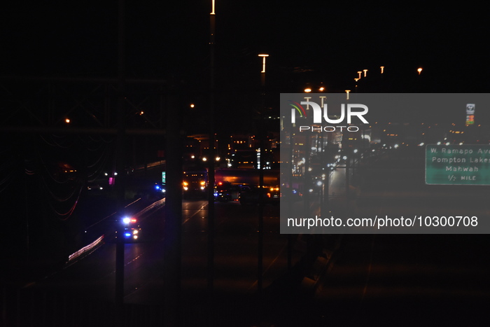 Overturned tractor trailer shuts down both directions of the highway in Mahwah, New Jersey, United States on July 25, 2023. Around 12:30 AM, Tuesday morning Mahwah police and the New Jersey Department of Transportation closed both directions of New Jersey Route 17 as they investigated an overturned tractor trailer. One person was extricated, however the condition of the person was not immediately known. Diesel fuel impacted storm drains and the tractor trailer's load was spilled on the roadway and therefore needed to be cleaned up. (Photo by Kyle Mazza/NurPhoto)