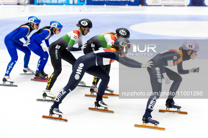 Elisa Confortola and Etienne Bastier are competing in the women's 3000m relay event on the first day of the ISU World Cup Short Track Speed Skating in Gdansk, Poland, on February 16, 2024. (Photo by Andrzej Iwanczuk/NurPhoto)