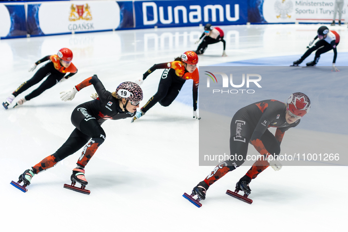 Claudia Gagnon and Kim Boutin are competing in the women's 3000m relay event on the first day of the ISU World Cup Short Track Speed Skating in Gdansk, Poland, on February 16, 2024. (Photo by Andrzej Iwanczuk/NurPhoto)