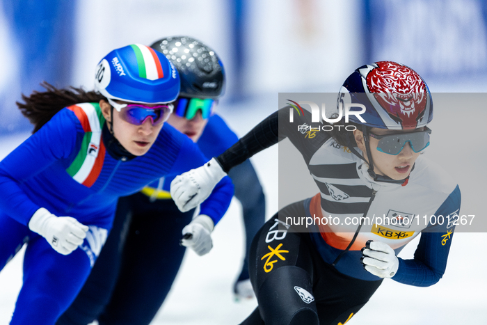 Jiwon Park is competing in the women's 500m event on the first day of the ISU World Cup Short Track Speed Skating in Gdansk, Poland, on February 16, 2024. (Photo by Andrzej Iwanczuk/NurPhoto)
