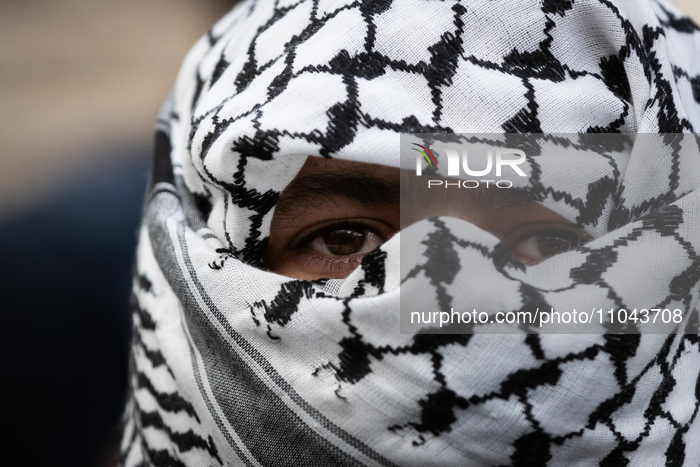 A demonstratori stands in front of the residence of Israeli Ambassador Michael Herzog as thousands protest Israel's planned ground invasion of Rafah, Gaza, where approximately 1.5 million Palestinians have taken shelter after following Israel’s orders to evacuate to the south, Washington, DC, March 2, 2024. The event is part of a worldwide demonstration of solidarity with Gaza, which is expected to draw millions of people from roughly 100 cities. (Photo by Allison Bailey/NurPhoto)