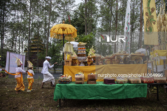 Balinese Hindus are performing the Rejang Dewa dance, a sacred dance in the Balinese Hindu belief, as they participate in the Tawur Kesanga ritual at Parahyangan Agung Pasundan Temple in Bekasi Regency, West Java, on March 10, 2024. During the Tawur Kesanga ritual, Balinese Hindus are worshipping and parading Ogoh-ogoh, effigies that represent demons or bad traits, which will then be burned as a symbol of victory over evil. The Tawur Kesanga ritual is the final series of rituals before the Nyepi, or Balinese Day of Silence, which this year will be celebrated on March 11. (Photo by Aditya Irawan/NurPhoto)