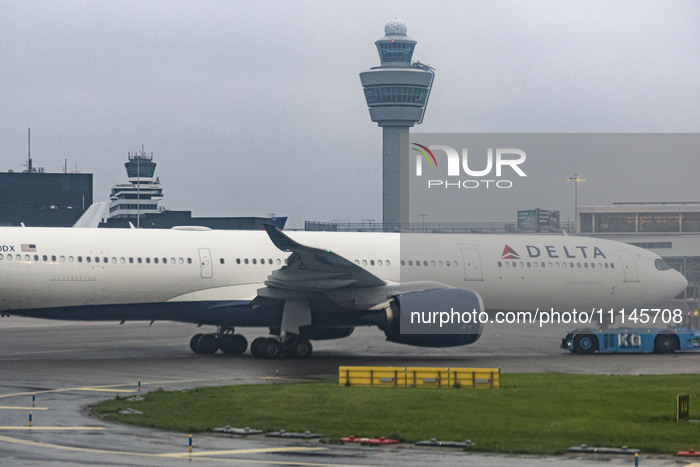 Delta Air Lines Airbus A330-900neo wide body passenger aircraft spotted while towed in Amsterdam Schiphol Airport AMS EHAM with the air traffic control tower visible, towards the gates of the airport terminal to operate the flight DL143, departing to Seattle SEA in the USA. The Airbus A330 - 900 airplane is powered by 2x RR jet engines and has the registration tail number N420DX. Delta or DAL is a major airline of the United States of America, a legacy carrier with headquarters in Atlanta, Georgia member of SkyTeam aviation alliance. Delta is the second largest airline in the world by passenger traffic and fleet size. Amsterdam, Netherlands on April 11, 2024 (Photo by Nicolas Economou/NurPhoto)