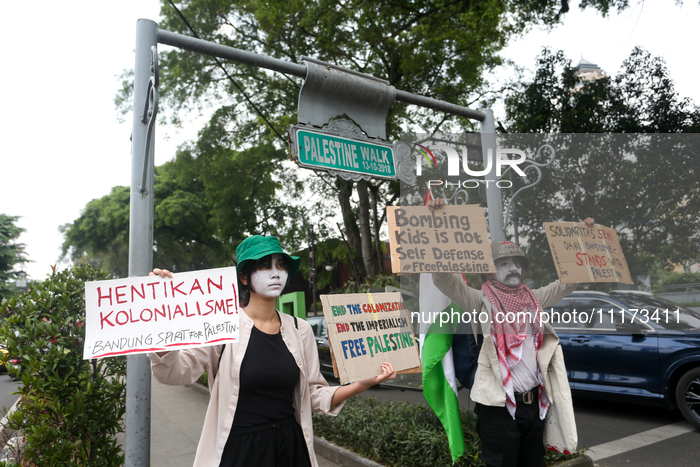 Pantonym artists are performing theatrical actions on foot as a form of solidarity with Palestine on Jalan Asia-Afrika in Bandung City, Indonesia, on April 24, 2024. (Photo by Ryan Suherlan/NurPhoto)