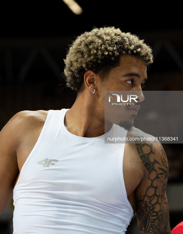 Jeremy Sochan is warming up before the basketball game between Poland and New Zealand in Katowice, Poland, on June 28, 2024. This is a friendly game at the Spodek Arena, preparations before the FIBA Olympic Qualifying Tournament. (Photo by Marcin Golba/NurPhoto)