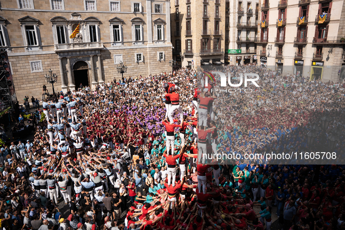 The different ''colles'' of the city raise their human towers in the Plaza Sant Jaume during La Merce, the city's popular festival, in Barcelona, Spain, on September 24, 2024. The ''castellers'' are a fundamental part of the culture and Catalan tradition. (Photo by Marc Asensio/NurPhoto)
