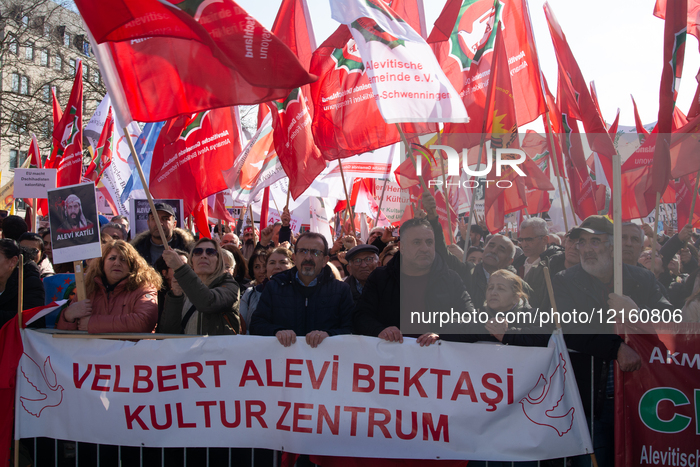 Thousands of people take part in a large demonstration against killing and violence against the Alawite minority in Syria in Cologne, Germany, on March 15, 2025, as reported by the Syrian Observatory for Human Rights, which states that more than a thousand civilians are killed by security forces after the toppling of President Bashar al-Assad. (Photo by Ying Tang/NurPhoto)