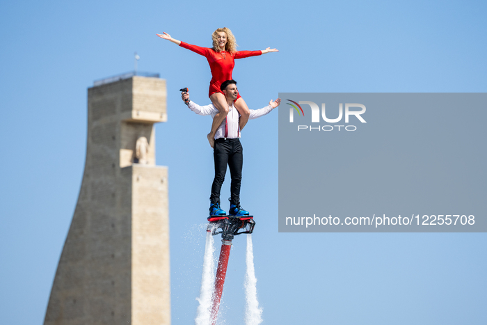 Mattia Lancia and Carlotta Infussi perform a Flyboard show with the Italian Sailor Monument (Monumento al Marinaio d’Italia) in the background, as part of the event marking the stopover of the Italian Navy’s school ship Amerigo Vespucci in Brindisi, Italy, on April 12, 2025. The historic Italian ship just completed a world tour, passing through 31 countries during a 20-month journey. (Photo by Manuel Romano/NurPhoto)