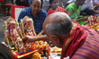 Hindu devotees worship idols of the Hindu gods Ganesh, the deity of prosperity, and the goddess of wealth Laxmi, during a ritual on the first day of the Bengali New Year inside a temple in Kolkata, India, on April 15, 2025. (Photo by Sudipta Das/NurPhoto)
