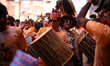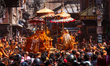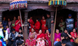 Nepalese devotees are covered in vermillion powder during the celebration of Sindoor Jatra in Thimi, Bhaktapur, on April 15, 2025. (Photo by Sanjit Pariyar)