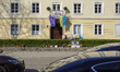 An anti-Putin protest banner is displayed on a balcony with EU and Ukrainian flags in Munich, Upper Bavaria, Bavaria, Germany, on April 12, 2025. The sign reads 'A world without Putin' in multiple languages, expressing solidarity with Ukraine and opposition to Russian aggression. (Photo by Michael Nguyen/NurPhoto)
