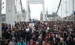 Akos Hadhazy, MP and organizer of a rally, blocks the Elisabeth Bridge and later marches to the Office of the Hungarian President in Budapest, Hungary, on April 15. The protests erupt after the parliament passes legislation restricting the right to assembly and banning Pride Marches. (Photo by Balint Szentgallay/NurPhoto)