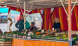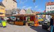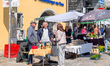 Shoppers buy fresh vegetables, fruit, and herbs at an outdoor produce market under green-striped canopies in Regensburg, Upper Palatinate, Bavaria, Germany, on April 19, 2025. The stalls offer local and seasonal products such as radishes, lettuce, pesto, and spinach, attracting customers of all ages. (Photo by Michael Nguyen/NurPhoto)
