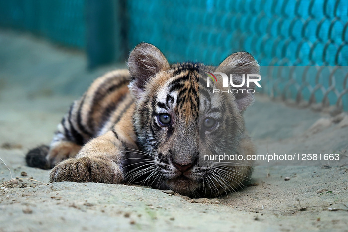 One of the five cubs born to tigress Rani is seen inside the enclosure at Nahargarh Biological Park in Jaipur, Rajasthan, India, on July 24, 2025. Rani gives birth to five cubs -- one rare white and four golden-striped -- on April 27. This is the first recorded instance in India of a tigress delivering five cubs in a single litter under a zoo-based conservation program. The cubs are monitored round the clock under the supervision of Senior Veterinarian Dr. Arvind Mathur and his team of caretakers. (Photo by Vishal Bhatnagar/NurPhoto)
