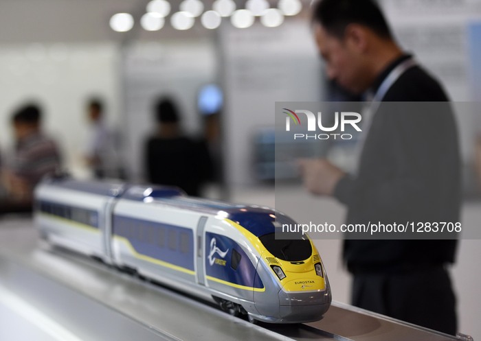 A visitor views a model of the Eurostar high-speed train at the exhibition "Modern Railways 2016" in Beijing, capital of China, June 20, 2016. The three-day exhibition kicked off here Monday.