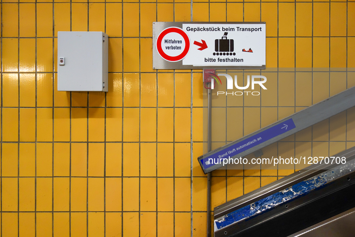 A warning sign instructs passengers to hold onto their luggage during transport on an automatic conveyor at a train station in Cham, Bavaria, Germany, on October 3, 2025. The signage indicates Deutsche Bahn safety rules for proper luggage handling. (Photo by Michael Nguyen/NurPhoto)