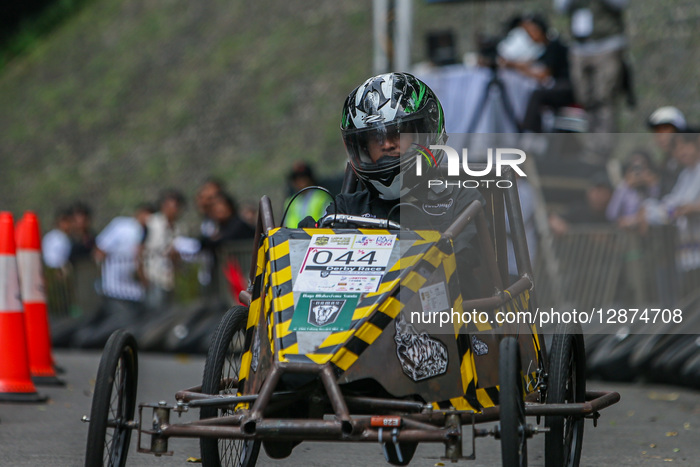 Participants race along the track during the 2025 Soapbox Derby at the Sasana Budaya Ganesha ITB cultural center in Bandung, West Java, Indonesia, on October 18, 2025. The competition, which features creative, engine-less vehicles relying solely on gravitational force, is part of the ITB Art Market 2025 festivities. At least 75 participants from various universities and vocational schools compete to traverse the 250-meter race track. (Photo by Claudio Pramana/NurPhoto)