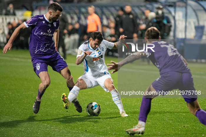 Defender Vladyslav Dubinchak of FC Dynamo Kyiv plays against players of FC LNZ Cherkasy during the 2025/2026 Ukrainian Premier League Matchday 12 game at the Valeriy Lobanovskyi Dynamo Stadium in Kyiv, Ukraine, on November 9, 2025. The guests defeat the Kyiv-based team 1-0. (Photo by Danylo Antoniuk/Ukrinform/NurPhoto) NO USE RUSSIA. NO USE BELARUS. (Photo by Ukrinform/NurPhoto)