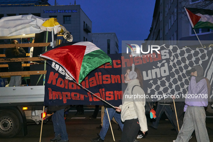 A protester with a Palestine flag participates in a Pro-Palestine demonstration in Leipzig, Saxony, on January 17, 2026. Pro-Palestine groups call for a demonstration in Leipzig Connewitz to protest against the Pro-Israel left-wing scene. Pro-Israel activists call to block and protest against the Pro-Palestine demonstration. The police deploy on a large scale. In the end, 3000 persons demonstrate. (Photo by Tonny Linke/NurPhoto)