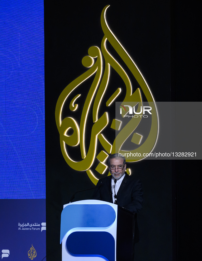 Iranian Foreign Minister Abbas Araghchi delivers the opening keynote speech during the 17th Al Jazeera Forum, themed ''The Palestinian Cause and the Regional Balance of Power in the Context of an Emerging Multipolar World,'' in Doha, Qatar, on February 7, 2026 (Photo by Noushad Thekkayil/NurPhoto).
