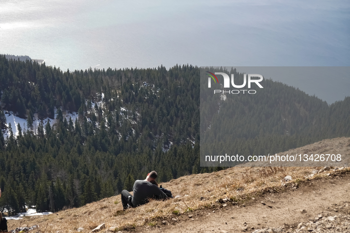 A hiker couple rests and views the mountain panorama on Jochberg summit near Jachenau, Bavaria, Germany, on March 7, 2026. The peak in the Bavarian Alpine Foreland between Walchensee and Kochelsee is a popular destination for day hikers seeking wide views of the northern Alps. (Photo by Michael Nguyen/NurPhoto)