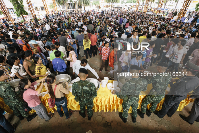 Cambodian migrant workers are fed by the Thai military before they cross the border and return to their homes in Cambodia during a mass exodus, Aranyaprathet Town Centre, Aranyaprathet/Poipet, Thailand. Fearing a crackdown on illegal immigration from the Thai military, over 120,000 Cambodian migrants are reported to have crossed the border and returned to Cambodia in one week. Estimates suggest that at least 150,000 legal and illegal migrants from Cambodia were working in Thailand before the exodus, typically in the construction and service industries. The Thai Foreign Affairs Ministry have rejected claims that illegal immigrants have been threatened or mistreated. - Photo: Gavin Gough/NurPhoto