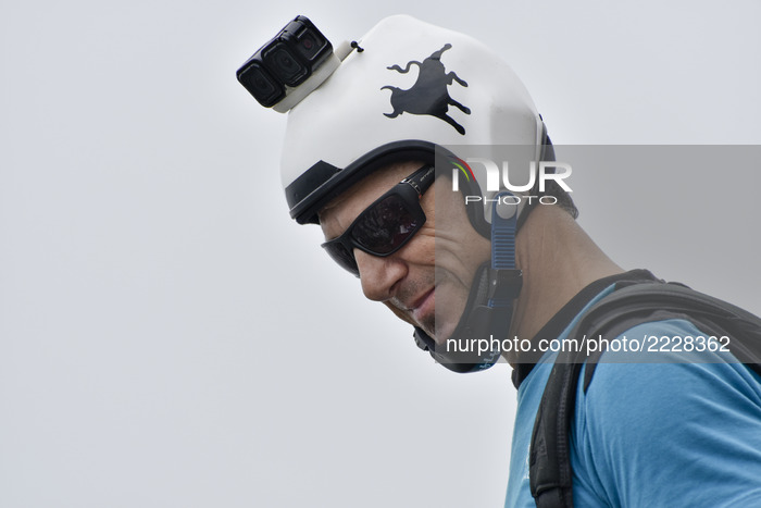 A male base jumper stand on 300-metre high open deck at Kuala Lumpur Tower during the Kuala Lumpur Tower Jump 2017 on Friday, September 29 in Kuala Lumpur, Malaysia. 120 professional base jumpers from 24 countries including Australia, Austria, Belgium, Brazil, Canada, Finland, Denmark, France, Ireland, Iran, Germany, Italy, Japan, Kuwait, Luxembourg, Netherland, New Zealand, Norway, Russia, South Africa, Switzerland, United States of America and Inited Kingdom. The event will take event from 30th September to 2nd October. (Photo by Chris Jung/NurPhoto)