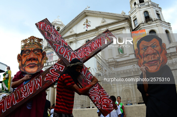 An activist carrying a cross stands in between other activists wearing Duterte masks. Various groups gather at Plaza Mirada on March 23, 2018 for a lent-themed demonstration to protest against the impunity, state terror, and anti-poor policies. (Photo by Bernice Beltran/NurPhoto)
