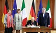 Berlin, February 28, 2013 - Italian President Giorgio Napolitano is welcomed by German President Joachim Gauck and Daniela Schadt at Bellevue Palace in Berlin. Photo: Reynaldo Paganelli/NurPhoto
