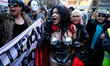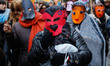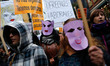 Prostitutes, some of them with her face covered with masks listen to an activist that is reading the manifesto at the end of the rally during a protest against the criminalization of prostitution in Madrid, Spain, Saturday, Feb, 15th 2014. About 150 sex workers have rallied this afternoon between La Puerta del Sol and Gran Via in Madrid, under the slogan 'No to persecution", "Negotiation of spaces now!" to protest against the criminalization of prostitution, the proposed Ordinance of Coexistence in Public Spaces, promoted by the city Hall of the capital, and the proposed Organic Law of Public Safety promoted by Spain's interior ministry. (Photo by Rodrigo Garcia/NurPhoto)