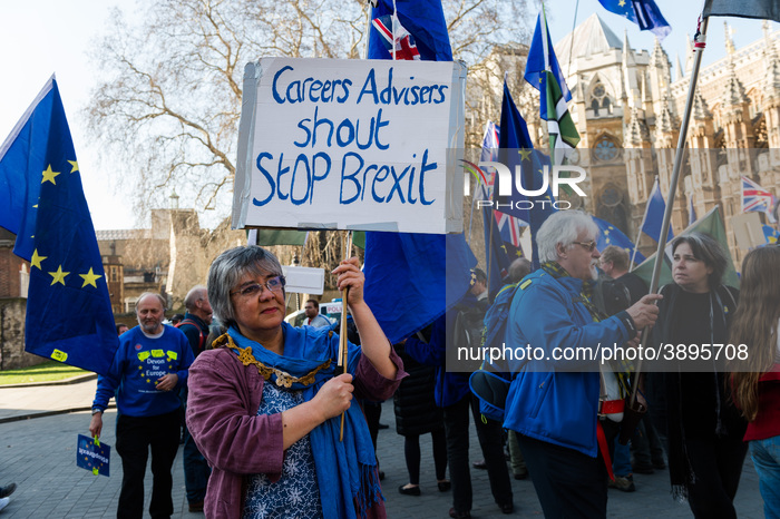 Pro-EU supporters protest outside the Houses of Parliament in London as they campain to stop Brexit and demand a People's Vote on EU membership on 27 February, 2019. Today MPs vote on amendments to government's Brexit motion as Prime Minister Theresa May has yesterday promised MPs a chance to vote on no-deal Brexit and extension of Article 50 should her revised Brexit deal be rejected during a 'meaningful vote' by 12th of March. (Photo by WIktor Szymanowicz/NurPhoto)