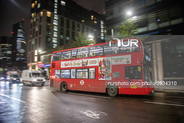 The new iconic buses in the streets of central London during the night, the red double decker Routemaster buses, introduced in 1956. The current buses are moving with a hybrid electric-diesel engine. The red bus become one of the landmarks of London and symbol for Great Britain. (Photo by Nicolas Economou/NurPhoto)