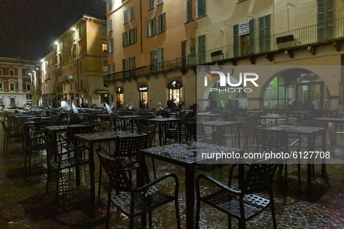 Closed restaurants in Brescia, Italy, on October 26, 2020. The new ordinance of the Prime Minister comes into force today. It provides, among other restrictions, the closure of bars and restaurants from 6 pm to 5 am and the total closure of theaters. (Photo by Stefano Nicoli/NurPhoto)