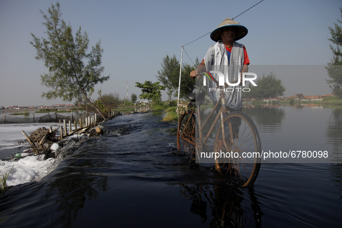 A man wih his bicycle crossing the overflowing polluted Asem Binatul river, in Pekalongan, Central Java province, on June 4, 2021. According to local residents the Asem Binatul river has been polluted for years, including dyes from some Batik fabric industries, which is an icon of the city of Pekalongan. (Photo by Aditya Irawan/NurPhoto)