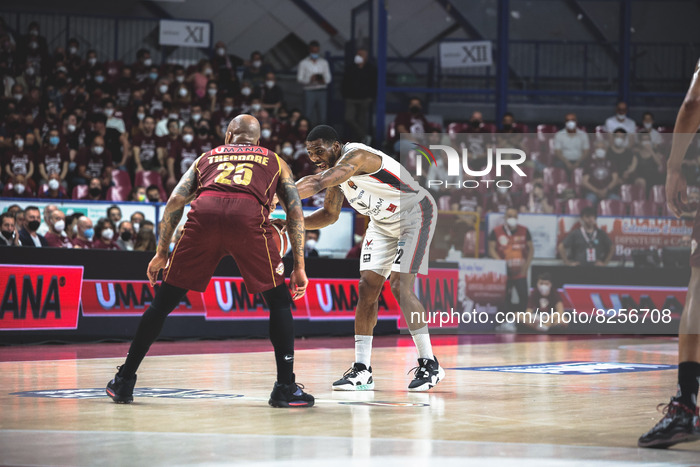 Jamarr Sanders (Bertram Derthona) and Jordan Theodore (Umana Reyer Venezia) during the Italian Basketball A Serie Championship Umana Reyer Venezia vs Bertram Derthona Tortona on May 19, 2022 at the Palasport Taliercio in Venice, Italy (Photo by Mattia Radoni/LiveMedia/NurPhoto)