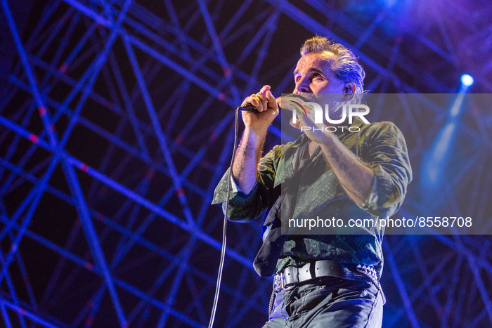Piero Pelu Frontman Litfiba singing on stage during the Music Concert Litfiba - L'ultimo Girone on July 18, 2022 at the Rock in Roma in Rome, Italy (Photo by Simona Scarano/LiveMedia/NurPhoto)