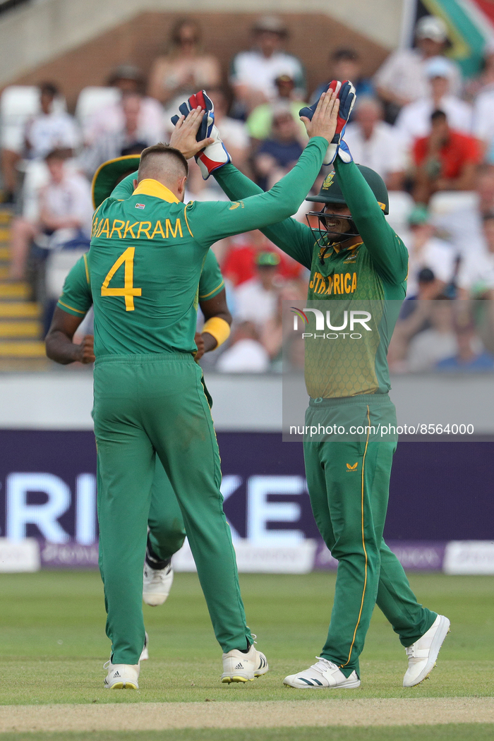 South Africa celebrate the wicket of Jonny Bairstow during the Royal London One Day Series match between England and South Africa at the Seat Unique Riverside, Chester le Street on Tuesday 19th July 2022. (Photo by Robert Smith/MI News/NurPhoto)
