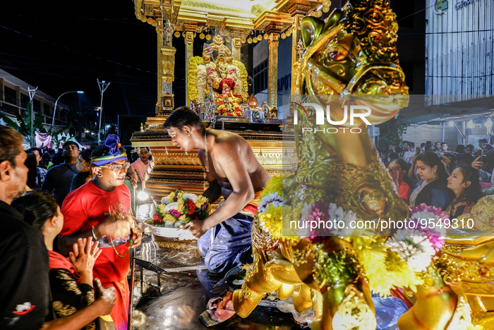 Indonesian Hindu-Tamil devotees make prayer offerings to a statue of god Muruga in golden chariot to be paraded during the Thaipusam festival on February 5, 2023 in Medan, Indonesia. Thaipusam is celebrated with faith, perseverance, and penance, as where a festival of thanksgiving and reverence by the Tamil people to the god of war and in commemoration of the day when Goddess Pavarthi gave her son Lord Muruga an invincible spear with which to destroy evil demons. (Photo by Ivan Damanik/NurPhoto)
