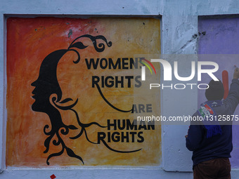 ''Women's rights are human rights'' is written on a wall as an artist pens powerful messages for society in Baramulla, Jammu and Kashmir, India, on December 23, 2025