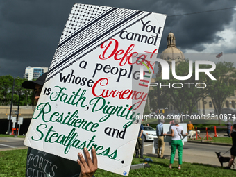 EDMONTON, CANADA - JUNE 27: Members of Edmonton's Palestinian diaspora, joined by local activists, gather at the north end of the High Level Bridge near the Alberta Legislature for the ''From Gaza City to Tehran - End the Genocide, No War on Iran'' protest, condemning the ongoing violence in Gaza and opposing the threat of war with Iran, on June 27, 2025, in Edmonton, Alberta, Canada.