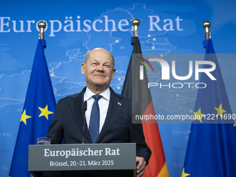Chancellor of Germany Olaf Scholz holds a press conference after the end of the European Council Summit, the EU leaders and head of states meeting. The German Chancellor addresses the media with a statement and responds to questions from journalists before the end of the briefing. Brussels, Belgium on March 20, 2025