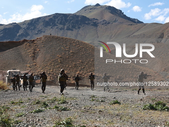 Indian army soldiers with the latest weapons, such as launchers, machine guns, and modern assault rifles, perform tactical drills on the occasion of the 26th Kargil Vijay Diwas in Kargil, Ladakh, India, on July 26, 2025. In a demonstration of its growing indigenous defense capabilities, the Indian Army showcases its latest high-tech artillery and weapons. The display features an array of cutting-edge systems, including upgraded assault rifles, advanced artillery, and specially designed drones for high-altitude and challenging terrains like Ladakh. Kargil Vijay Diwas, celebrated on July 26, commemorates India's victory over Pakistan in the Kargil War of 1999.