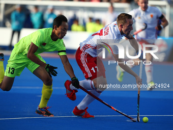E Liguang of China holds of Barry Middleton of England during The Men's Hockey World League 2017 Group A match between England and Chinaat The Lee Valley Hockey and Tennis Centre in London on June 15, 2017