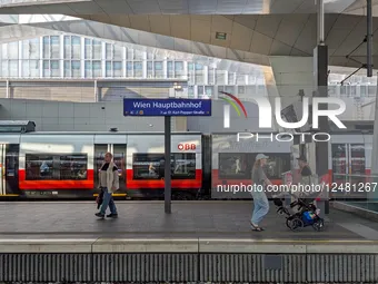 OEBB (Austrian Federal Railways) trains are at the platforms of Vienna Central Station (Wien Hauptbahnhof) in Vienna, Austria, on June 10, 2025. The station serves as Austria's main rail hub for domestic and international connections.