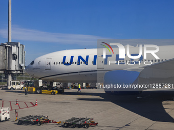 Boeing B777 passenger airplane of the US airline carrier UNITED spotted at Munich Airport, the Flughafen München MUC EDDM an international airport in Bavaria, Germany. The Boeing 777-200 ER is a wide body aircraft made for long haul and transatlantic flight with the registration tail number N786UA and is powered by 2x PW 4090 jet engines. United Airlines is a major airline in the United States with headquarters in Chicago, one of the largest in the world with a fleet of 1050 planes and member of Star Alliance aviation group. Munich, Germany on August 5, 2025