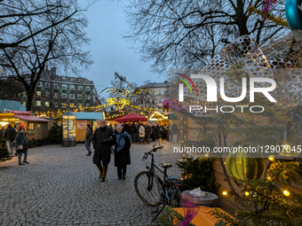Crowds of people gather around brightly illuminated wooden stalls offering food and drink at the Haidhauser Christmas Market (Weihnachtsmarkt) in Munich, Bavaria, Germany, on December 11, 2024.